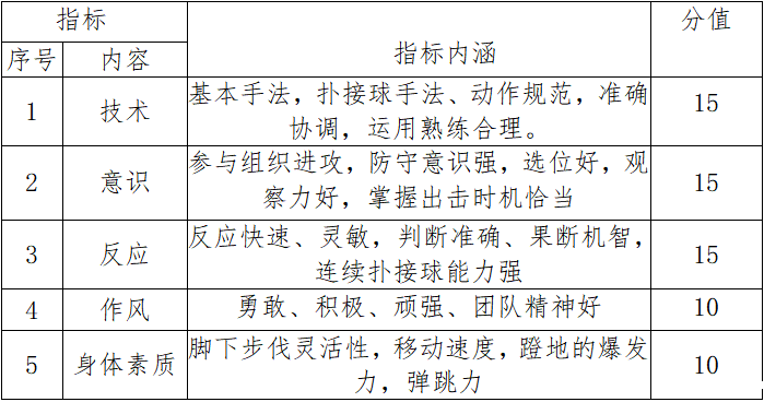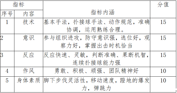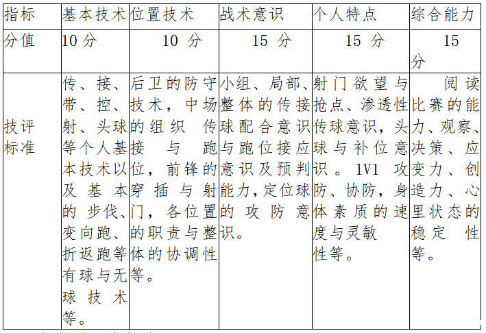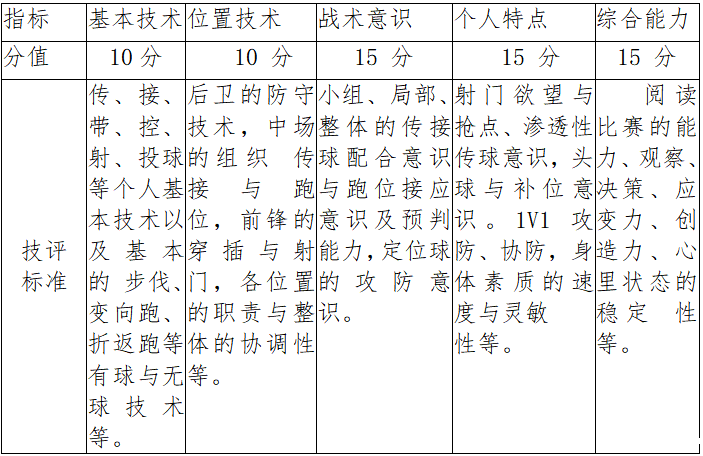 (2)成绩评定:由 3 名评委根据评分标准对考生的基本技术、位置技术、战术意识、个人特点、综合能力等 5 个方面进行综合评定。